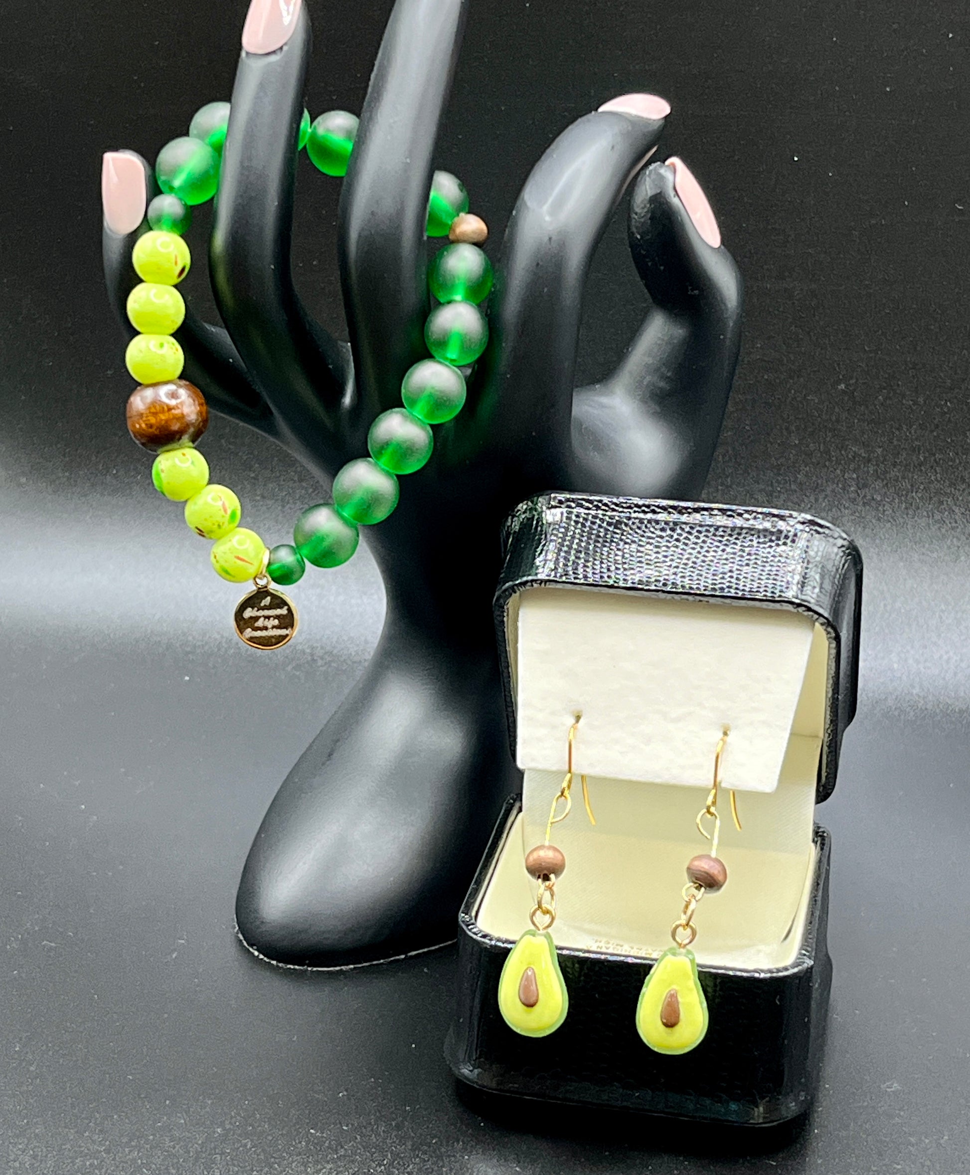 Bring some funky fun to your outfit with our Avocado earrings and matching green bead bracelet. These accessories are perfect for any avocado lover and will add a playful touch to any look. Plus, they are made with high quality materials for long-lasting wear. (Can you say "guac" and roll? Sorry, even I think that joke is pretty "pit-i-ful").