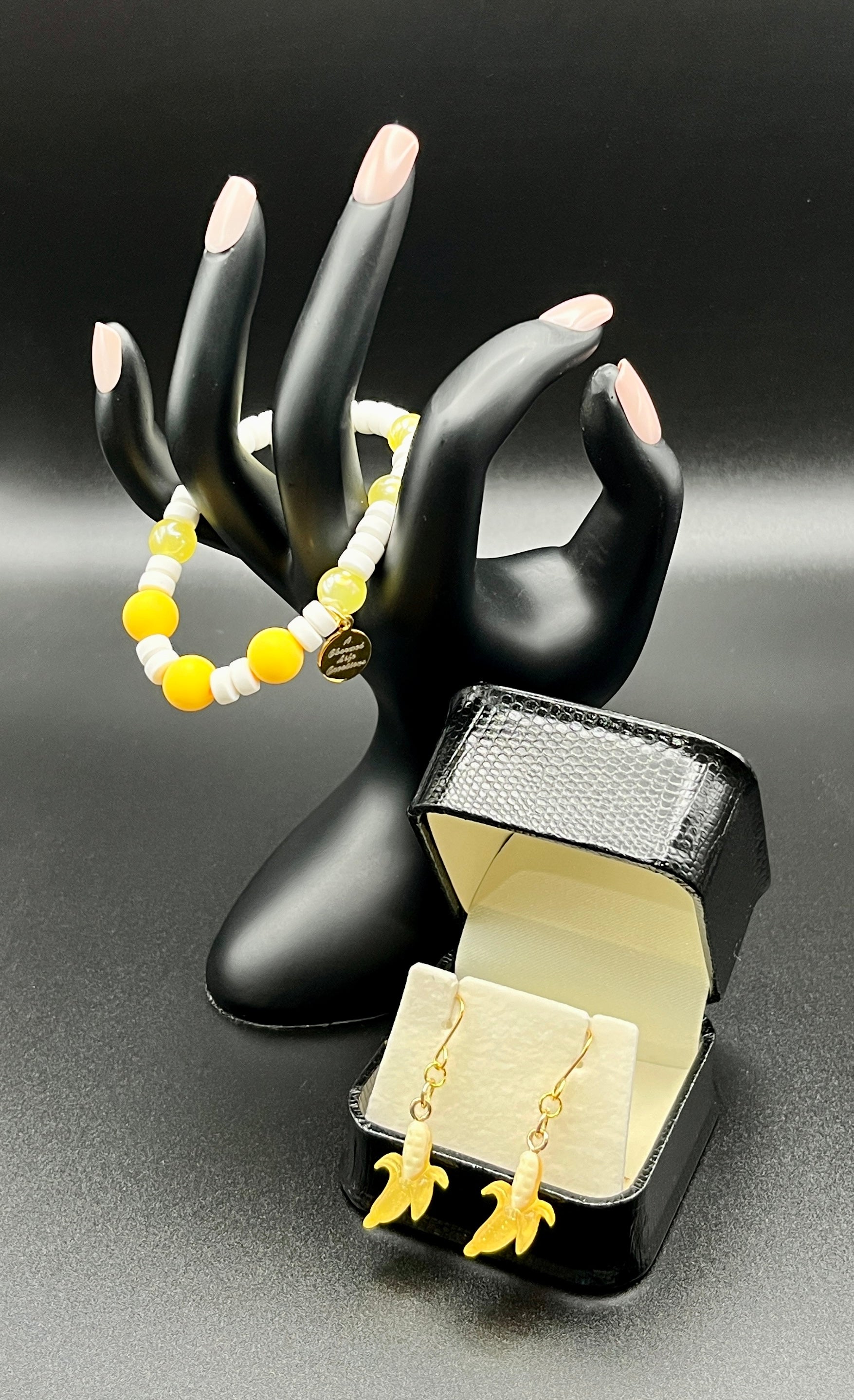 Go bananas with our Top Banana set! These quirky earrings are shaped like bananas, with a fun pop of yellow and white. Coordinate them with the matching bracelet for added style. Perfect for playful fashion lovers. (Because who doesn't want to be top banana?!)