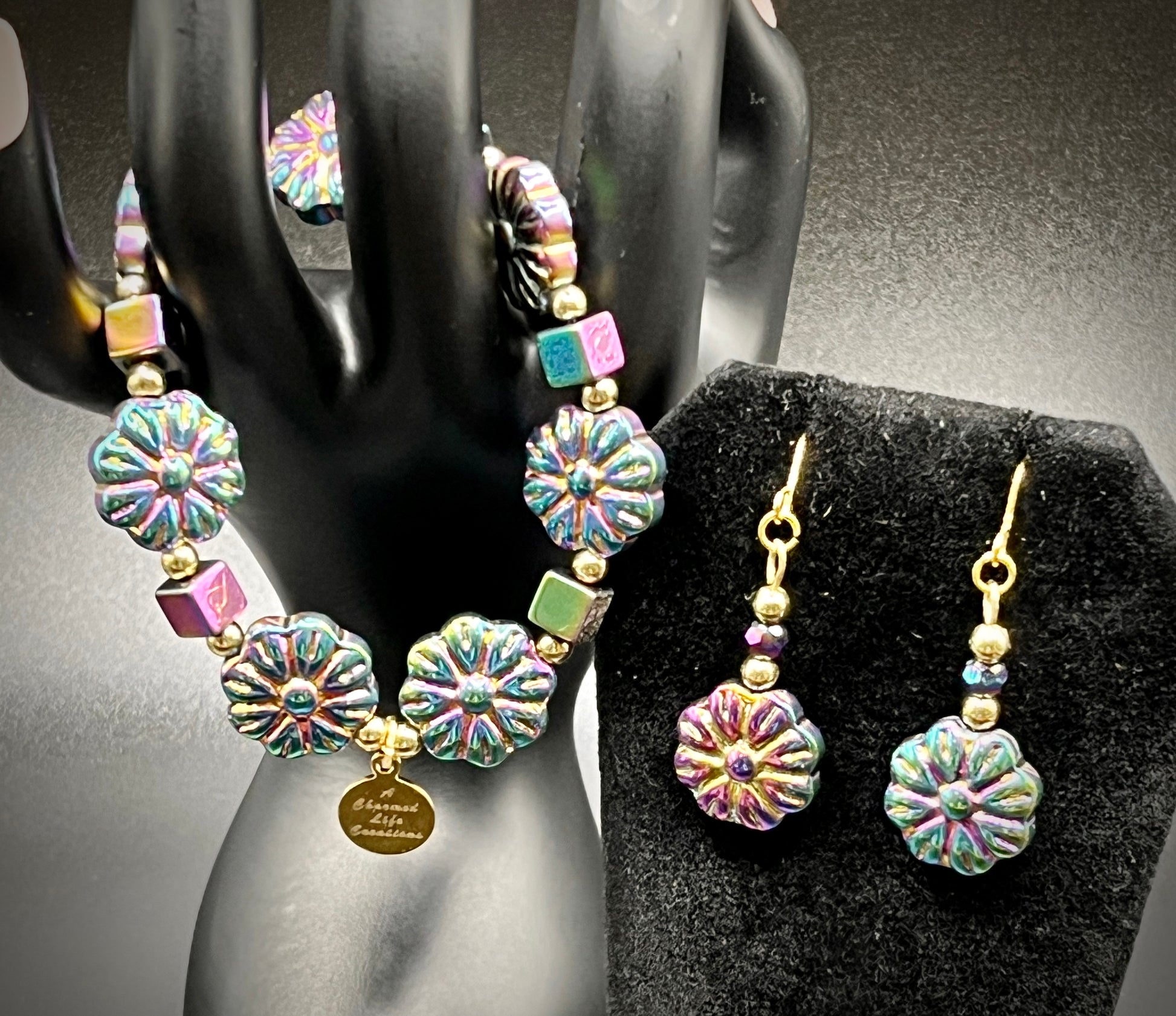 Add a touch of whimsical elegance to any outfit with this Flower Power earring and bracelet set. Featuring iridescent flower shaped beads and a unique square bead design, these delicate earrings and bracelet add a touch of feminine charm. Embrace your inner flower child and add a playful and sophisticated touch to your wardrobe.