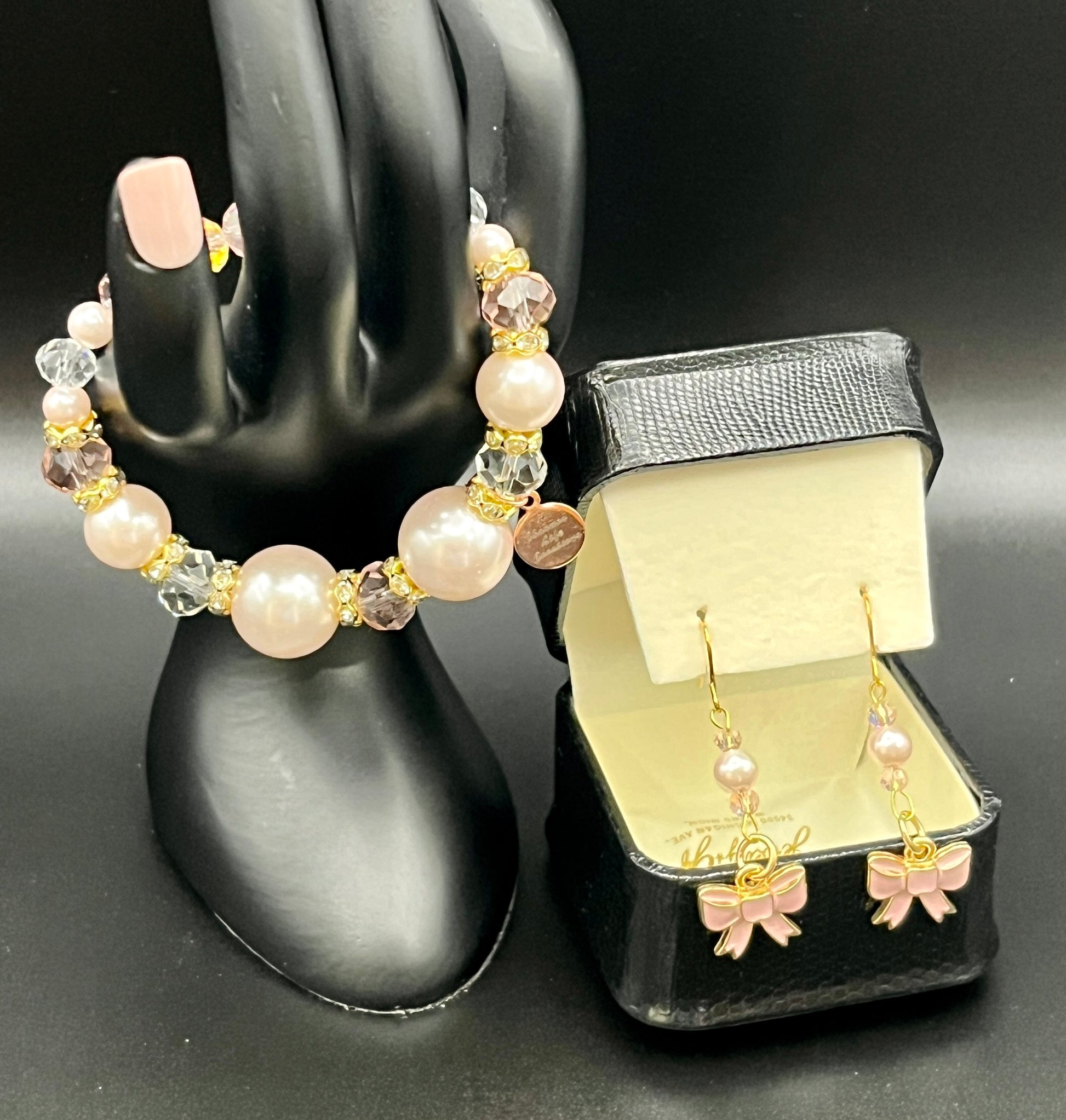 Delicately wrapped in a beautiful pink bow, this set features stunning pink bow earrings and a coordinating bracelet with gold accents. Perfect for adding a touch of grace and sophistication to any outfit. Embrace the luxury of this elegant and exclusive design.