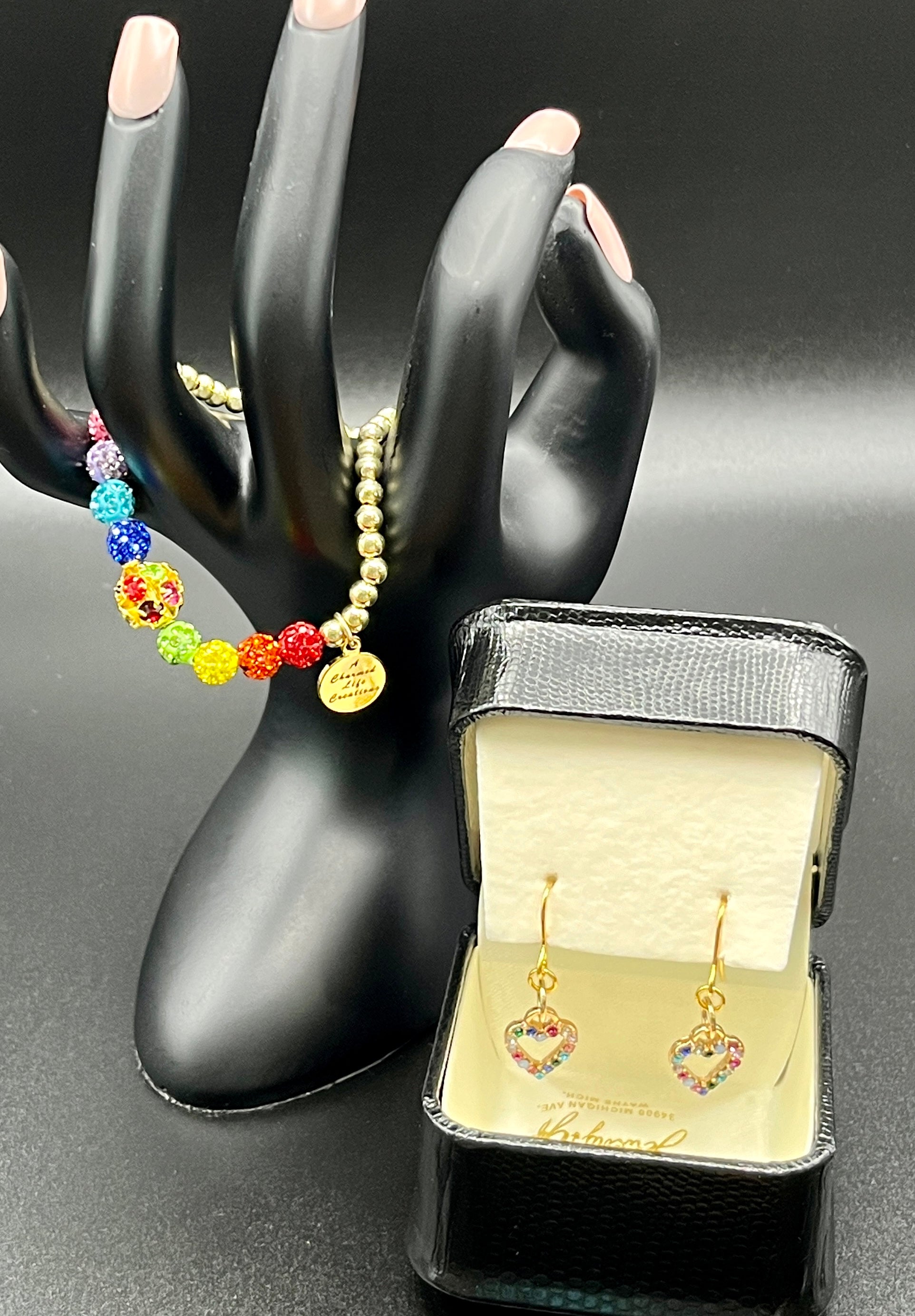 Spread love and color with Follow the Rainbow! These heart shaped earrings come with a playful rainbow bead bracelet, adding a pop of quirk and style to any outfit. Perfect for someone who loves to stand out and embrace their unique, fun-loving self.