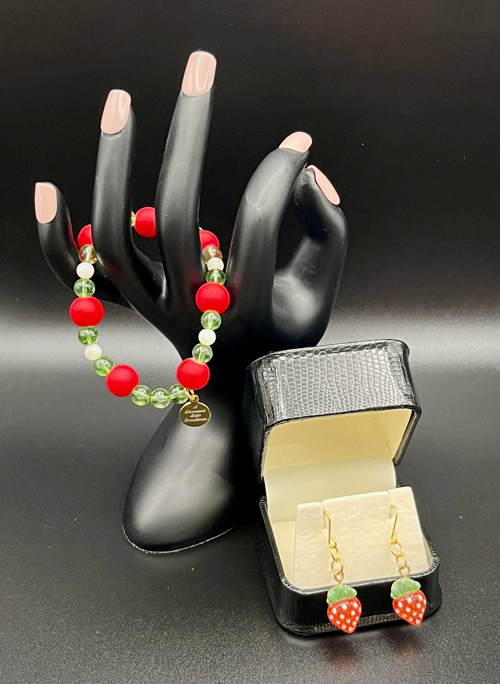 Add some fruity flair to your outfit with Strawberries No Shortcake earrings and bracelet set. These strawberry-shaped earrings and matching red and green bead bracelet are perfect for any occasion. No baking required!