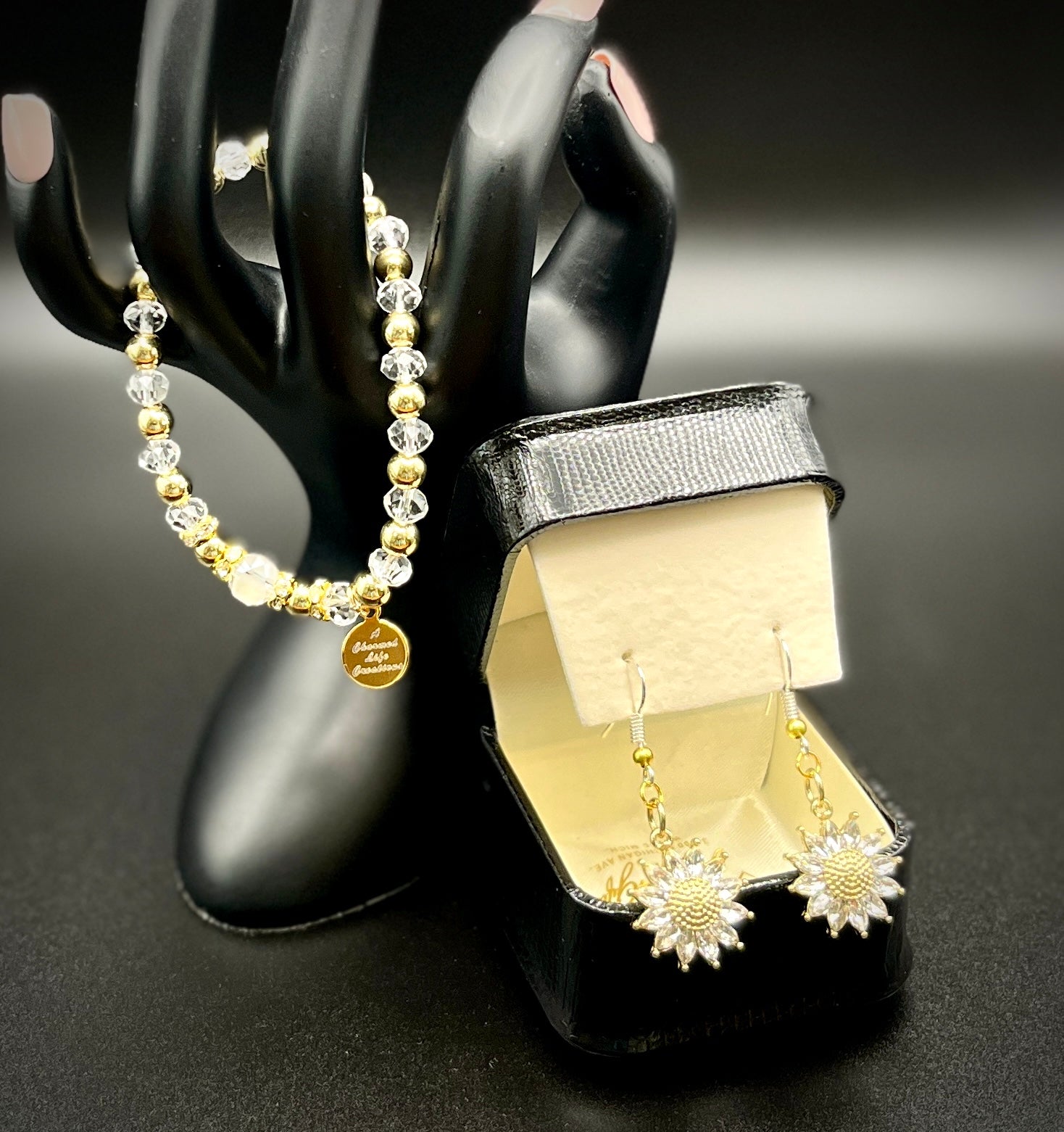 Indulge in the timeless beauty of our Sunflower Petals & Shine set. Adorn yourself with crystal sunflower earrings, sparkling with every step, complemented by a gold and crystal bracelet. Make a statement and enhance your outfit with this sophisticated and exclusive accessory set.